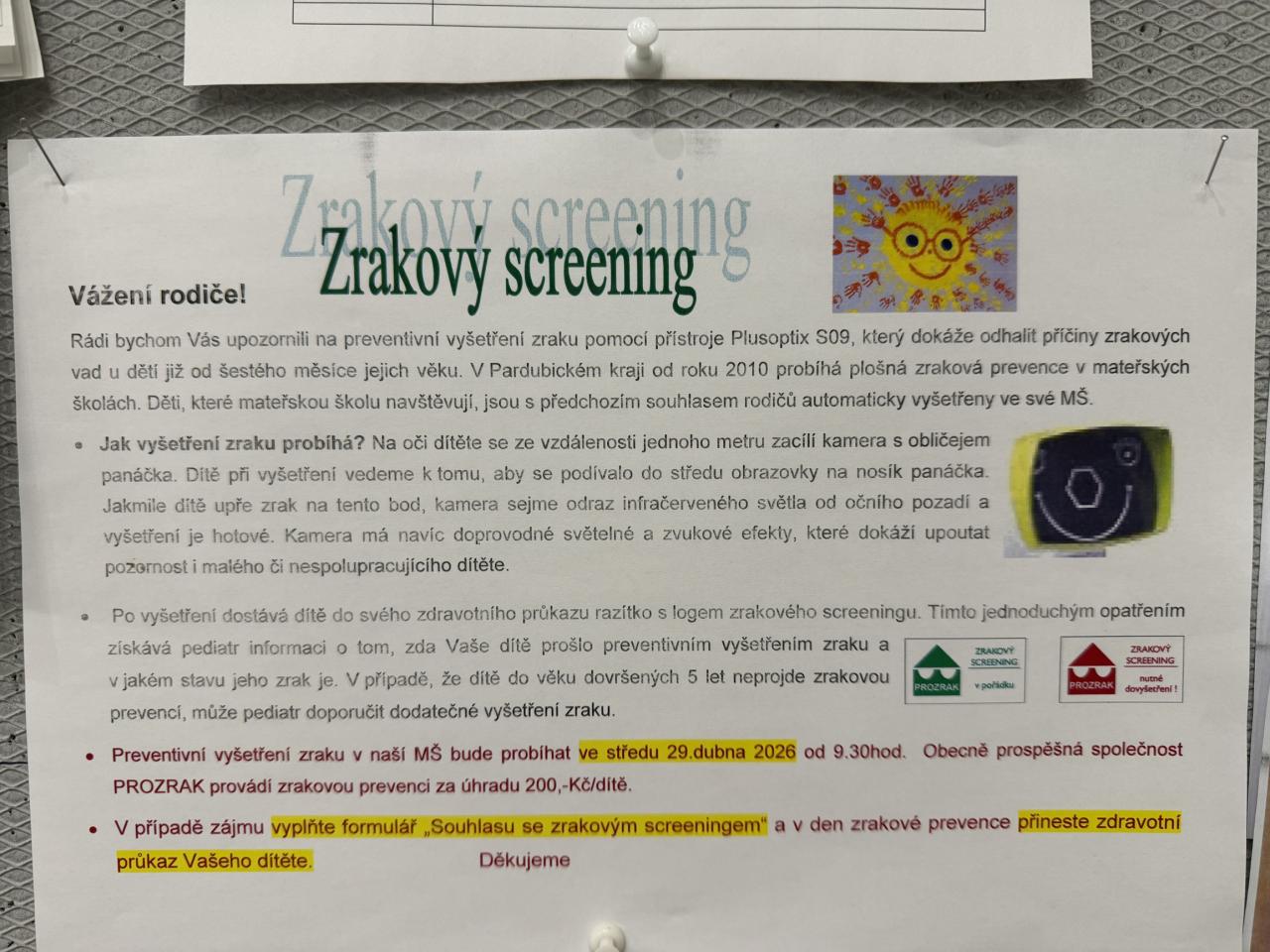 Pokud budete mít o vyšetření svého dítěte zájem, zapište ho do tabulky ve třídě.Zraková prevence bude provedena společností PRO ZRAK za úhradu 200 Kč, kterou si můžete nechat proplatit zdravotní pojišťovnou. V den vyšetření přineste zdravotní průkaz dítěte.